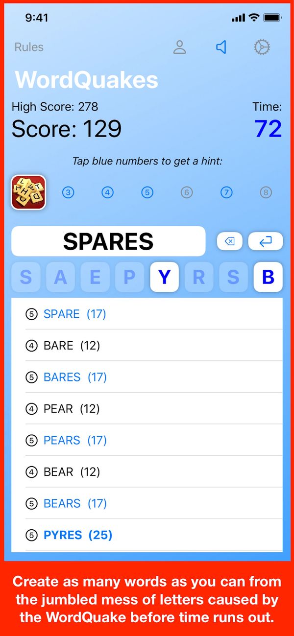 The WordQuakes scramble the letters of a word and you only have a limited amount of time to recreate it and any other words you can find from the jumbled mess of letters.